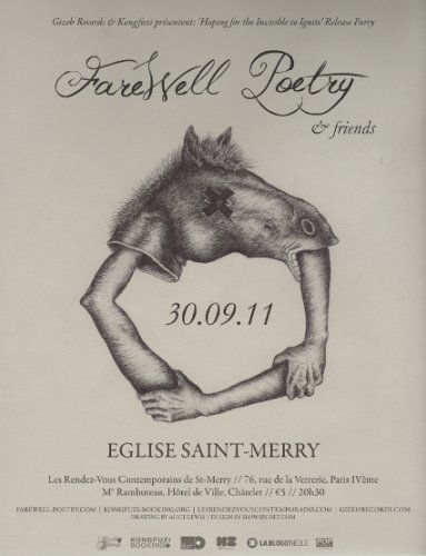 À l’occasion de la sortie, la même semaine, du premier album de FareWell Poetry (dont il sera prochainement rendu compte sur ces pages), le groupe se produisait à l’Église Saint-Merry, située entre le Centre Pompidou et la rue de Rivoli. Bien qu’ayant déjà vu la formation à deux reprises sur scène (à Glaz’art et à la Java, les deux fois en 2009), nous ne l’avions pas encore évoqué ici, préférant attendre de l’apprécier dans un cadre plus approprié à l’ampleur de ses propositions. Précisément, une église semblait parfaitement idoine et le public ne s’y était pas trompé, venant en masse, dépassant apparemment les prévisions des organisateurs qui rajoutèrent à la hâte quelques rangs de chaises supplémentaires. L’entrée des spectateurs ayant été retardée, ce n’est que vers 21h30 que FareWell Poetry s’installa dans le chœur de l’édifice gothique, tout juste éclairé par des bougies et de rares projecteurs.