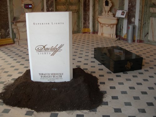 En revanche, on fut plus convaincu par deux grandes installations situées dans deux des grandes pièces du rez-de-chaussée. Interprétant peut-être un peu trop littéralement le concept de liberté et le dialogue entre France et Estonie, Jevgeni Zolotko a brûlé des livres et magazines pour en récupérer les cendres, en faire du papier mâché, et tracer avec les contours de la Bastille (Fondation). Dans la salle précédente, Stefan Nikolaev érige des sépultures en forme de paquet de cigarettes, rappelant aussi bien la fin des illusions attachées au communisme en vigueur auparavant en Estonie que les mentions « fumer tue » inscrites sur les paquets.