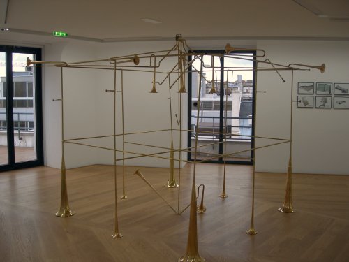 À la suite de tant d’autres lieux et institutions, l’Espace culturel Louis Vuitton propose une exposition attachée aux liens entre musique et art contemporain. Avec seulement huit artistes et autant d’œuvres, Anicroches tente ainsi d’aller plus loin que le jeu de mots de son titre pour regarder les accointances entre ces deux disciplines. Sans surprise, on retrouve alors les traditionnelles combinaisons entre instruments réels et sculptures : Thierry Mouillé agence des cuivres pour réaliser une création tenant du cube ajouré tandis que Rémy Jacquier constitue une maquette en forme de pavillon auditif.
