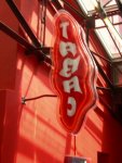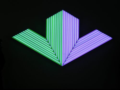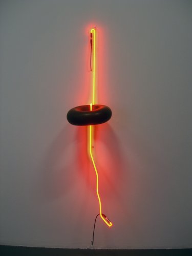 Par ailleurs, on pourra aussi déplorer ne trouver à la Maison rouge que de rares installations composites (sinon un Daniel Firman associant pneu et néon, un Lucio Fontana réunissant peinture et néon ou un Pierre Bismuth agrégeant plusieurs couleurs) et de rares travaux sur la structuration de l’espace, sinon François Morellet et ses grands rectangles enchâssés ou Carlos Cruz-Diez et ses cloisons dont on a l’impression qu’elles diffusent elles-mêmes de la lumière. Plus généralement, si Néon. Who’s afraid of red, yellow and blue ? s’avère plastiquement intéressante, elle se montre scientifiquement frustrante : en somme, on tient là une bonne recension mais qui ne propose pas vraiment de réflexion sur le medium et, fondamentalement, place toutes les utilisations du néon sur le même plan. Par conséquent, quand on quitte le lieu, on regarde dans la vitrine la réclame pour Rose Bakery comme on a regardé plusieurs des créations pleinement artistiques.