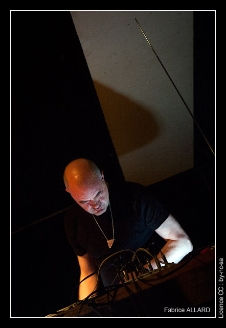 C’est ensuite au tour de MKM et c’est cette fois sur scène que ça se passe. De gauche à droite on trouve d’abord Jason Kahn au synthé analogique, puis sur une grande table Günter Muller et ses iPods, et enfin Norbert Möslang avec diverses machines électroniques dont certaines qui sont certainement de sa fabrication.