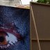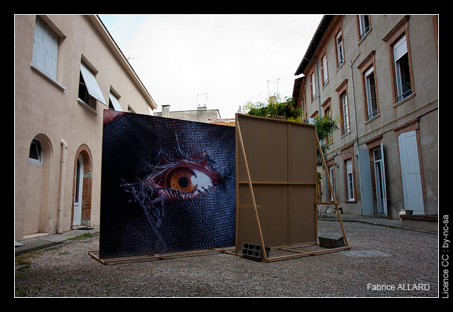 On descend ensuite la rue Perchepinte (où se trouve l’Hôtel de l’Archevêché où se produisait Nils Frahm) puis la grande rue Nazareth pour arriver à l’Hôtel Bertrandi qui abrite le foyer de jeunes travailleurs Espérance et l’installation de Bertrand Arnaud & Juliette Chapelier. L’espace est plus grand, plus ouvert, tout en longueur. En entrant, on voit d’abord un grand panneau, genre 4mx3m, avec une immense photo d’un œil. En se rapprochant, on devine un masque de pierre au sein de l’iris, et en faisant le tour on découvre l’autre panneau qui lui fait face, simplement pourvu d’un film-miroir. Échange de regard, intimité créée par les quelques centimètres qui séparent les deux panneaux, on verra cette installation comme un espace dans l’espace, comme la cours est un espace, à moitié fermé, dans un autre espace qu’est la ville. Autant de cours, autant de regards.