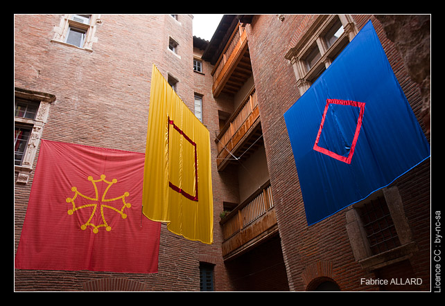 _ On commencera dans la cours de l’Hôtel de Boysson-Cheverry où Julien Alins part du drapeau occitan qui fait partie des lieux, pour en faire des déclinaisons et combinaisons, en se limitant aux couleurs primaires. Alors qu’il pénètre dans la cours, le visiteur ne voit rien de particulier. Il faut lever les yeux pour voir ces drapeaux flotter dans les airs, et si l’on n’était pas venu dans le cadre du festival Courtoisie on n’aurait certainement pas réalisé qu’il s’agissait là d’une œuvre d’art, détournant les codes régionaux.