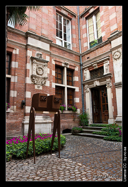 On poursuit notre chemin par la rue Croix-Baragnon où se trouve l’Hôtel Thomas de Montval. Une cours sublime, arcades d’un côté, palmier au centre, avec déjà un petit air de dépaysement. Pablo Garcia nous propose ici une expositions de photographies stéréoscopiques. Six supports, croisements entre vieil appareil photographique et robots, présentent des photos d’animaux et objets ramenés de l’époque coloniale. Les photos sont ici tellement dans le cadre que l’on se surprendra parfois à regarder derrière l’appareil, pour voir si ce crocodile ou cette statue ne sont pas réellement présents dans la cours de l’hôtel.