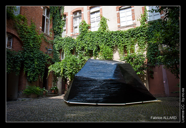 Pour finir on remonte la rue du Languedoc et on bifurque vers la rue Joutx-Aigues afin de rejoindre l’Hôtel de Rességuier investit par Pierre Clément. Au milieu d’une cours de toute beauté, une forme noire et brillante, géométrique comme un cristal, entourée de néons sur sa base. On pense à un OVNI, une météorite, on imagine cette cours chargée d’histoire, toute de brique sur laquelle la nature tente de reprendre ses droits et ses habitants qui, un matin découvrent l’objet venu d’ailleurs. Simplicité, épure des lignes et beauté n’ont d’égal que le contraste saisissant entre l’œuvre et le lieu, mais un contraste qui est aussi la force de cette pièce qui est le point d’orgue de cette tournée des cours d’hôtels particuliers.
