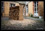On arrive ensuite place Saint-Scarbes, à l’Hôtel du Bourg où exposent Marion & Julie Brusley du Collectif In Out. Le lieu a moins de charme, il apparaît plus modeste. En entrant dans la cours, on ne voit qu’un tas de bois, disposé en son centre, comme une réserve de bois de chauffe partagée entre chacun des résidents. Et puis en faisant le tour de l’œuvre, on réalise qu’une partie est façonnée, reprenant des détails architecturaux des bâtiments. Une pièce qui met donc l’accent sur la cours comme lieux de partage mais montrant aussi l’importance de la main de l’homme qui a transformé les lieux. Les propriétaires de cet hôtel ont toujours été proche de la scène artistique, ils ont fait du mécénats, et certains logements sont maintenant des ateliers d’artistes.