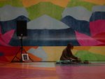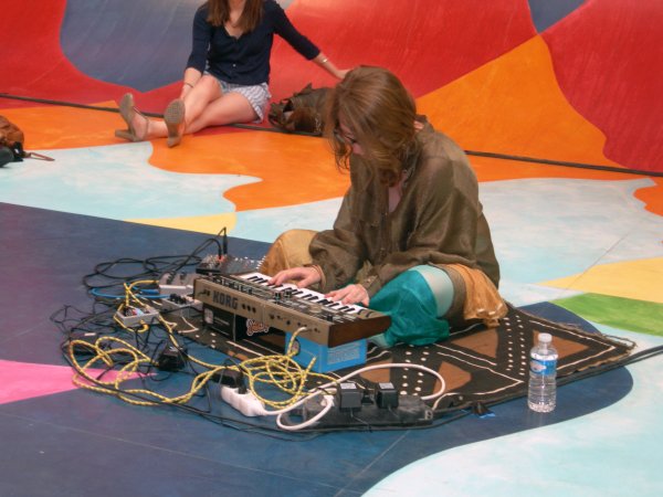 Assise à même le sol, entourée du public, Je Suis Le Petit Chevalier joua pendant une heure, entre 19h et 20h, dans un lieu encore très lumineux grâce à l’absence (temporaire ?) de faux plafond au-dessus du « Païpe » et aux larges ouvertures donnant sur l’esplanade du Palais de Tokyo. Bien que connaissant bien la musique de la jeune femme, on fut toujours marqué par la manière dont, en l’absence de rythmique en tant que telle, elle parvint à imprimer une forme de cadence avec l’oscillation conférée à ses accords et nappes. Les ajouts successifs d’éléments plus ou moins sonores, plus ou moins lumineux et plus ou moins abrasifs permit, en outre, de dépasser le simple cadre contemplatif.