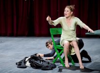 De fait, tout au long de la pièce, l’onirisme estival se trouve très présent : la végétation est souvent citée, faune et flore apparaissent, des pépiements d’oiseaux se font entendre, le soleil décline au fur et à mesure de la dramaturgie… Ce contexte permet aux deux personnages de se livrer plus aisément, entamant un échange enlevé, oscillant entre confidences et souvenirs, expériences personnelles et récit plus fantasmé. Dès le début, une interrogation se fait jour quant à l’identité des protagonistes : estivants venant de se rencontrer, (anciens) amants, personnages au seuil de la mort ou déjà au purgatoire et faisant le bilan de leur vie ou bien acteurs au soir d’une représentation ? C’est cette piste qu’explore majoritairement la mise en scène : large rideau rouge en fond de plateau, mini-vestiaire côté jardin surplombé d’un panneau lumineux « Bitte Ruhe » (« Silence SVP »), citations de Tennessee Williams dans la conversation, phrases comme « c’est ce qui était prévu » laissant imaginer que ce qu’on voit n’est que la résultante de quelque chose convenu auparavant.