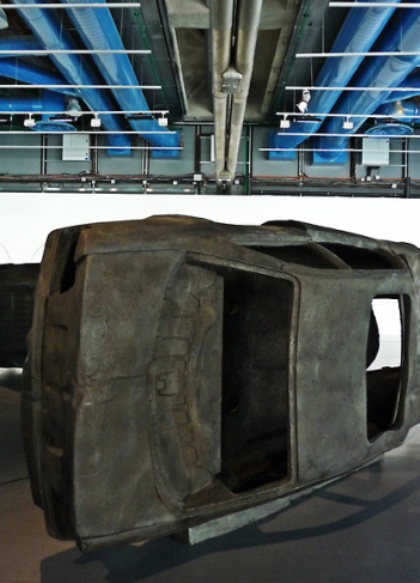 La présence de ces véhicules brûlés permet alors de faire le lien avec la grande thématique qui traverse la monographie et de concevoir feu et flammes dans une lecture para-religieuse qui infuse même l’affiche de l’exposition (Abdessemed lui-même, entouré de flammes insérées numériquement, tel un martyr ignifugé). Si cette double veine produit quelques résultats saisissants, l’ensemble souffre néanmoins, à l’image de cette affiche, justement, d’un caractère performatif et démonstratif un rien ostentatoire ; comme si, non content de travailler des obsessions, le plasticien tenait à tout prix à nous en surligner la portée.