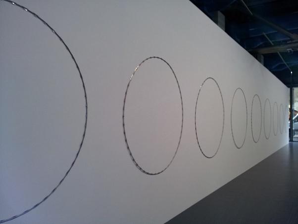 La dimension très largement mystique, voire parfois quasi-sulpicienne, de la production d’Abdessemed nous a également frappés. La vidéo God is Design, avec ses cercles tournoyant, les quatre crucifix géants en fer barbelé, accrochés côte à côte (Décor), la performance vidéo Also Sprach Allah en sont d’évidents témoignages. Mais, baigné dans cette atmosphère, on peut aussi rattacher à cette thématique spirituelle les cerceaux métalliques de Wall Drawing, ornant tout le mur est de la Galerie et s’apparentant à des mandalas, la sanctification de Zidane avec cette statue géante, la petite truie tétant une jeune femme, symboliquement mère nourricière universelle. Dans un tel contexte, l’évocation du Paradis (Hope, barque censée secourir des réfugiés) et de l’Enfer (avec une peinture de Monsù Désiderio et la grande intervention d’animaux calcinés, comme s’ils avaient atteints les cercles infernaux, qui lui fait face) n’étonnera pas.
