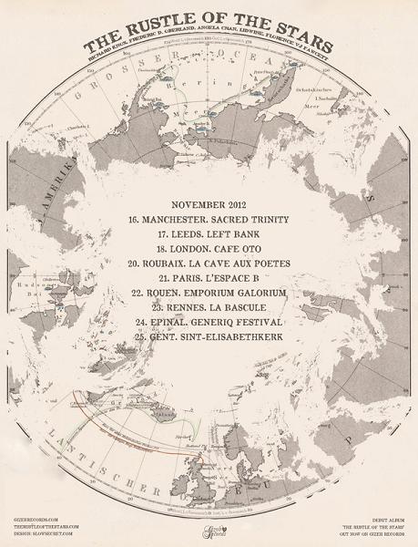Peu après 22h15, The Rustle Of The Stars prirent place sur une scène déjà foulée six mois auparavant. Si le duo de base était toujours bien présent (Frédéric D. Oberland et Richard Knox), une nouvelle fois accompagné par Lidwine, l’altiste avait changé (Angela Chan à la place d’Elaine Reynolds) et une violoncelliste (Florence VJ Fawcett) avait rejoint l’ensemble. Musicalement, l’impression fut peut-être moins forte que la première fois mais il s’agit toutefois de saluer la capacité du groupe à donner le sentiment d’improviser alors qu’on imagine la chose beaucoup plus écrite qu’il n’y paraît. De fait, le mélange des nappes générées par les guitares des deux hommes (grattées, jouées à l’e-bow ou pincées), par l’harmonium (parfois difficile à percevoir), par le Glockenspiel ou par les cordes créait une musique enveloppante dont la durée semblait aléatoire.