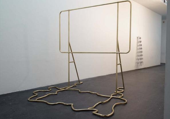 Enchevêtrée dans une présentation alternée (les salles sont réparties entre les deux artistes, mais de manière non continue), l’exposition de Régis Pinault nous permet de découvrir ce plasticien d’origine lyonnaise. Assez classiquement, le créateur travaille sur le détournement d’objets que l’on peut croiser au quotidien, changeant leur destination ou les augmentant d’éléments extérieurs. Ainsi ajoute-t-il une boule en verre à un maillet de croquet pour tenter de matérialiser l’impact avec la boule de ce jeu de plein air, des morceaux de résine sur un tube néon ou bien une sérigraphie (yeux et texte) sur un caisson lumineux façon enseigne commerciale.