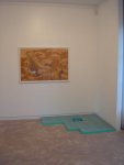 Avec son trait presque naïf dans ses peintures dans lesquelles de petits personnages sont plongés dans un paysage très vaste qui semble les engloutir, comme paraît engloutie la maison de Sous les Dalles, Anne Brégeaut se met ainsi en symbiose avec son sujet, décliné au fil d’une proposition homogène et convaincante. On y trouve, par ailleurs, la figure récurrente du trou (Le Trou, Le Trou Noir), échappatoire pour atteindre ce Pays du jamais-jamais qui apparaît même dans son installation L’Heure Bleue, recréation d’une pièce d’une petite maison avec un œil-de-bœuf laissant apparaître l’extérieur.