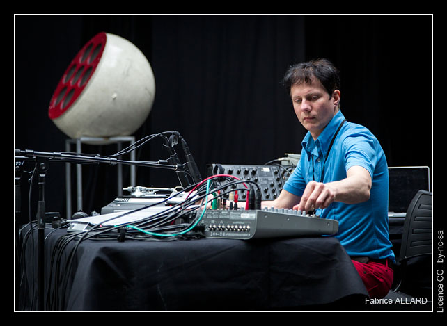 Les concerts s’enchaînent assez rapidement, aussi voilà Felix Kubin qui fait son apparition sur scène. La dernière fois que nous avions vu l’Allemand, c’était en 2001, au Nouveau Casino. Il produisait alors une musique festive et ludique, déguisé en robot ou extraterrestre.