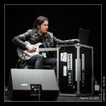 Les deux musiciens sont chacun à un bout de la scène. L’un bien sage derrière son laptop fait plutôt penser à un employé de bureau tandis que le second est bien dans son rôle avec ses cheveux longs, sa guitare et son blouson en cuir. Seule ombre au tableau, un laptop pour lui aussi afin de traiter le son de sa guitare.