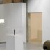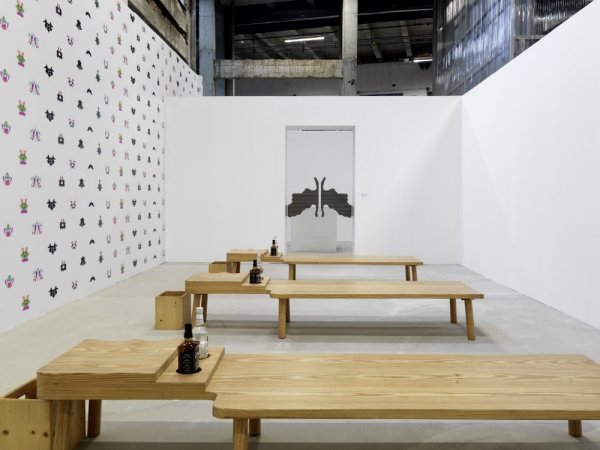 Décalé, ce geste dit le recul avec lequel François Curlet envisage le monde qui l’entoure, recul qu’on peut retrouver dans la fascination développée pour la mort et les œuvres-tombeaux. Une Jaguar reconvertie en corbillard accueille, par exemple, le spectateur à l’entrée de l’exposition, un poste de télévision façon pierre tombale en granit et marbre trône au centre de la première pièce, une installation se veut évocation de l’appartement du Paster Pandy, serial killer bruxellois et on peut même raccrocher à cette thématique le Bunker pour six œufs en béton, à la fois coque de protection renforcée mais aussi forme de crypte mortuaire. Pour quitter l’univers de Curlet et retourner dans le monde « normal », le plasticien nous invite à passer dans le Rorschach Saloon, sas de décompression dans lequel les célèbres taches recouvrent les murs tandis que vodka et whisky sont proposés au visiteur pour ouvrir un peu plus ses sens.