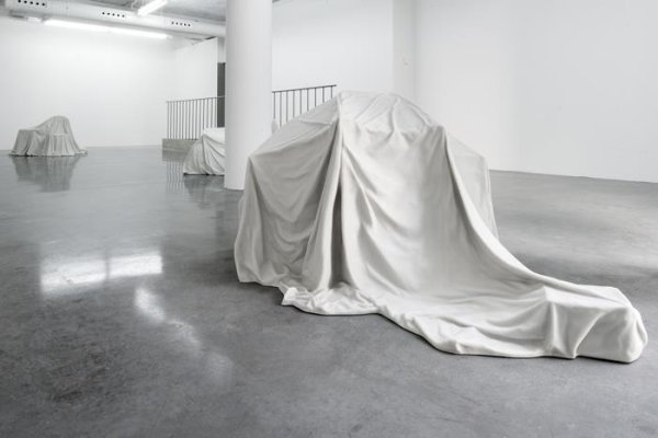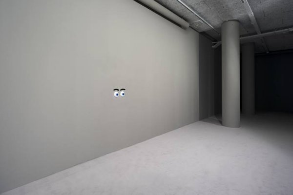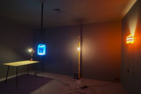 Légèrement ironique, le propos de Gander interagit aussi avec le visiteur dans Magnus Opus, paire d’yeux animés s’activant au passage d’une personne. Parfaitement appréciée des enfants parcourant l’exposition, cette œuvre rejoint alors celle précisément créée autour de la fille de l’artiste. Série de trois sculptures, I is… représente les cabanes confectionnées par la bambine de trois ans à base de chaises, parapluie, tréteaux, séchoir à linge et drap ; sauf qu’au lieu d’apporter ces composants tels quels, l’Anglais a fixé en marbre cette composition. Manière un peu utopique de figer ce qui est par nature éphémère (la cabane ainsi construite par sa fille ne restait jamais au-delà d’une journée), ce procédé confère, dans le même mouvement, une forme de sacralité à cet habitat précaire. Enfin, continuant une série dont on avait déjà vu un extrait au Palais de Tokyo il y a quelques mois, Ryan Gander confectionne des lampes pour son épouse, à base de matériaux achetés en grande surface (articles ménagers, éléments de bricolage), et auxquelles il affecte chacune une couleur différente. Réunie dans la même pièce, ces quatre lampes, faux ready-mades, forment autant de cadeaux dérisoires et attentionnés à la fois.