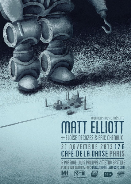 Le jour est enfin venu où Matt Elliott joue en tête d’affiche. Après plusieurs dates régulières au Café de la Danse, ces dernières années, le musicien de Bristol se produit à l’occasion de la sortie de Only Myocardial Infarction Can Break Your Heart avec une formation particulière. C’est accompagné d’un contrebassiste, d’un batteur et d’un guitariste/claviériste qu’il effectue la tournée de son sixième album, de quoi bousculer ses fans, habitués à son assortiment solitaire de guitare et de voix profonde.