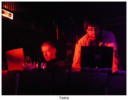 Pourtant il s’agit bien des deux membres de Twine qui viennent de débuter leur concert et enchaînent musique électronique granuleuse, aride, avec une sorte de chant religieux à faire pâlir les fans de Dead Can Dance sur des textures aux reflets métalliques. Ils passent ainsi du coq à l’âne avec une facilité déconcertante, et tout cela nous paraît tout à fait logique. Des rythmiques sourdes et syncopées flirtent avec les sonorités métalliques d’un Fennesz, les sons les plus agressifs dessinent des mélodies à la fois complexes et touchantes.
