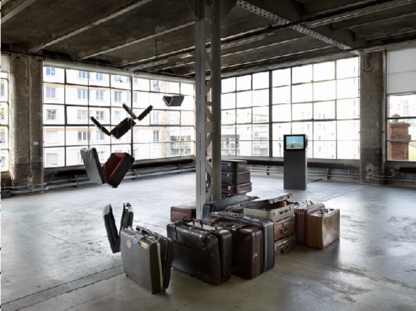 Assurément, des trois espaces, celui dédié au voyage est le plus intéressant, parce qu’il tire, comme presque tous les créateurs appelés à exposer au Crédac, admirablement profit des conditions de monstration. Ainsi une installation à base de valises qui s’envolent progressivement laisse imaginer que les œuvres vont s’échapper par les grandes baies vitrées du bâtiment, rêvant d’un ailleurs que la vue sur la cité du Val-de-Marne offre. De même, les mocassins géants (Honey I’m Home (Egg)) font appel à cette envie d’évasion tandis que la bottine en cuir surdimensionnée abrite une petite maison et renvoie également au panorama visible à l’extérieur. Dans un registre plus burlesque, la vidéo About soufflé voit un même personnage changer d’univers géographique à chaque changement de plan, sautant d’une ville à l’autre, alors qu’un film, davantage poétique, met en scène un bonhomme de neige errant dans un désert, une valise à la main, lui aussi habité par un désir voyageur (If I Were Tree Among Trees (Si j’étais arbre parmi les arbres)).