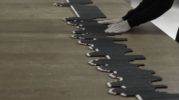 Au-delà de l’aspect musical, l’interprétation peut évidemment infuser de nombreux autres champs et domaines : les ikebanas de Camille Henrot (branches de chêne vert, ail d’ornement et citrons en lieu et place des traditionnelles compositions florales délicates) en témoignent, tout comme les maquettes de Benjamin Seror (tentatives de matérialisation de concepts) et les affiches de Lili Reynaud-Dewar (reprenant des textes du designer italien Ettore Sottsass). Assurément, cette notion d’ « interprétation » et la figure de l’ « interprète » sont suffisamment vastes pour embrasser largement, et, à force, l’impression que tout est dans tout (et réciproquement) peut commencer à se faire jour. Néanmoins, quand cela conduit à présenter des œuvres touchantes, nonobstant leur caractère très rudimentaire, ceci n’importe guère. Et, précisément, c’est le cas avec les trois vidéos du duo Marie Cool et Fabio Balducci : gestes simples (rapprocher des feuilles de papier dans un phénomène de collision, déplacer des crayons noirs pour former une onde, faire pointer un rayon lumineux sur une feuille blanche), matériel basique (papier-crayon), absence d’effet mais résultat hautement probant.