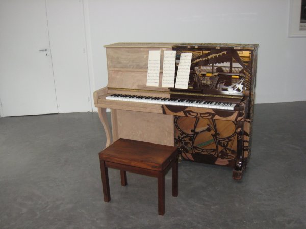 Pour cette nouvelle présentation des récentes acquisitions du FRAC Île-de-France, Xavier Franceschi a choisi la thématique de l’interprétation et pioché alors dans la collection du FRAC plusieurs œuvres ayant en commun cette notion. Assez logiquement, une bonne partie des pièces montrées tourne autour de la musique, dans la lignée des nombreuses expositions ayant eu lieu ces dernières années autour de cette thématique. Avec ce point de départ, l’interprétation peut être directe ou évocatrice : directe quand il s’agit de demander à un pianiste de jouer une partition sur un piano (Arirang Partitions de Thu Van Tran) ou pour Pierre Paulin, qui accroche des vinyles dans des pochettes plastiques, évocatrice chez Haroon Mirza, qui construit une installation-hommage à Ian Curtis (diffusion en boucle d’une bribe de chanson de Joy Division, vidéo d’un concert…), quand Damir Očko fait « dire », en langue des signes, trois expériences liées à la musique et au silence ou bien lorsque Joseph Grigely, devenu sourd à l’âge de 11 ans, se concentre sur les photographies de journaux accompagnant les critiques de spectacles d’art lyrique. On le saisit : il s’agit, à chaque fois, d’opter pour une approche non frontale puisque même le piano de Thu Van Tran est divisé en deux (une partie juste poncée, une autre sculptée artisanalement) et que la feuille de partition est également coupée en deux, dans la longueur, forçant le musicien à laisser des mesures de silence, faute de notes à jouer.