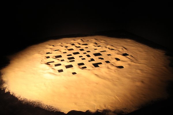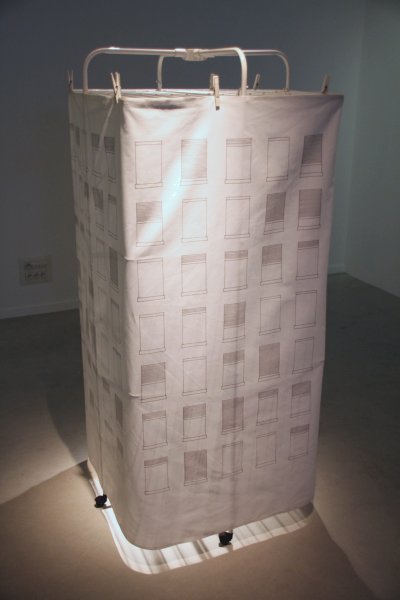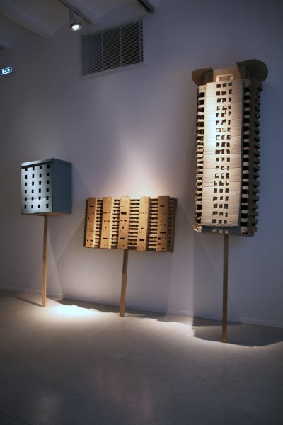 Fort de ce point de départ, on trouvera, logiquement, quelques créations très littéralement inspirées de techniques architecturales : Building d’Hugues Reip (simple tissu orné de fenêtres entourant un Tancarville), installation de Kader Attia dans laquelle des moules sont venus, façon pochoirs, marquer de leur empreinte une étendue de graines de couscous donnant l’impression d’un plan masse d’un ensemble urbain ou encore la série Anarchitekton de Jordi Colomer, célèbre pièce combinant vidéo de l’Espagnol brandissant, telles des pancartes par ailleurs exposées, des maquettes géantes d’immeubles. Mises en contrepoint des créations de « villes spatiales » suspendues de Yona Friedman, ces dernières œuvres répondent parfaitement au principe de Double Jeu.