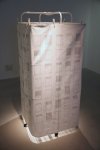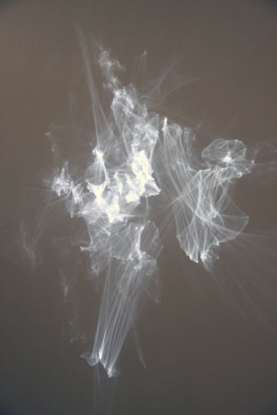 Pour les plasticiens, l’architecture, urbaine notamment, peut relever davantage de l’imaginaire futuriste : Sarah Fauguet et David Cousinard réalisent ainsi un volume entre cabine d’ascenseur et caisson permettant de voyager dans le temps ou l’espace (SAS (Version B)) alors que Cécile Beau utilise de la verrerie chimique, en assemble les ustensiles, pour constituer une cité quasi-fantastique. Si la présence de la vidéo Anomalies Construites de Julien Prévieux, qu’on visionnait pour la troisième fois, peut être un peu laborieusement raccroché au thème de l’exposition (les utilisateurs de Google SketchUp y racontent leur expérience du logiciel), un effort de projection mentale est enfin requis du spectateur face à la Réplique de Bertrand Lamarche. Nouvelle réussite du Français, cette œuvre associe bras articulé, réflecteurs et projecteur pour donner l’impression d’un entrelacs relevant aussi bien de la toile d’araignée que des volutes de fumée ou des nœuds des fibres musculaires ; de fait, cet entremêlement peut s’apparenter également aux bretelles autoroutières et autres croisements de circulation.