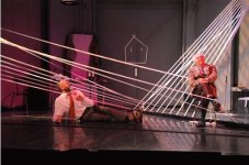 Une fois saisie la formule, nous en venons à deviner, dès les premières secondes de chaque saynète, quelle sera la chute… et l’auteur ne nous déçoit nullement sur ce point. De surcroît, les virgules musicales placées entre chaque temps, plutôt que de ponctuer malicieusement l’action, surlignent à gros traits ce qui se serait voulu « comique ». Dans le même temps, afin d’occuper l’espace, les interprètes se déplacent au milieu de sangles blanches qu’ils ne cessent d’accrocher et décrocher, tissant une sorte de double toile d’araignée sur laquelle ils trébuchent régulièrement (traduction involontaire de leur propre difficulté à évoluer dans ce spectacle ?). Puisque nous en sommes à mentionner les aveux involontaires, relevons enfin cet autre début de saynète : « Dis-moi, Mario, on perd son temps ou c’est juste une impression ? ». Rien à ajouter.