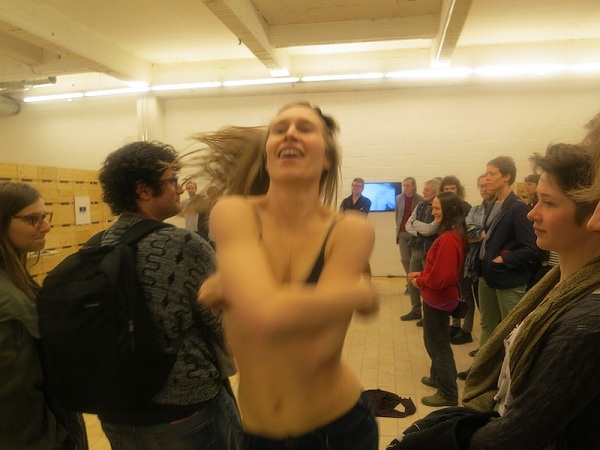Dans les premiers temps, la configuration spatiale induit évidemment une forme de malaise, générée par la nudité dont se pare rapidement la jeune femme, comme par le fait de devoir se déplacer sans cesse pour aller regarder une vidéo ou lire un article de presse, occasionnant regards et frôlements entre spectateurs. Au fur et à mesure, chacun apprivoise l’espace et l’ensemble se détend, profitant aussi bien de la faconde de Mette Ingvartsen, faisant volontiers preuve d’humour, que de son énergie communicative. Dans ses exposés, la Danoise n’évite cependant pas quelques poncifs, nous expliquant que le désir est régi et structuré non par les personnes elles-mêmes, mais par le contexte sociétal qui les entoure, ou filant la métaphore de la nudité comme véritable costume du performeur, bien plus signifiant que tout éventuel vêtement.