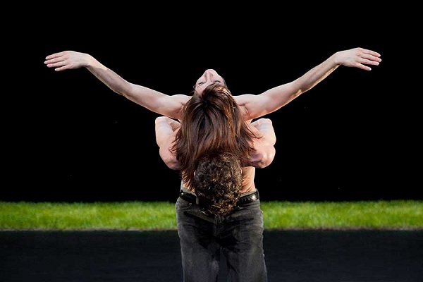L’arrivée de deux danseurs donna naissance à un duo mixte, puis un quatuor, l’onirisme et la référence picturale du début s’éloignant au profit d’une très forte sensualité, à peine douchée par la pluie générée par un tuyau d’arrosage. Mélange des corps (torses nus pour la moitié des interprètes), entremêlements, déhanchés suggestifs, poses allusives et lascivité étaient alors convoqués, en même temps qu’une énergie et une technicité certaines. D’impressionnants portés où, d’une seule main, Sylvère Lamotte soulevait Marthe Krummenacher et la posait sur son épaule, ou bien enroulait Perrine Valli autour de lui, purent ainsi métaphoriser des rapports charnels.