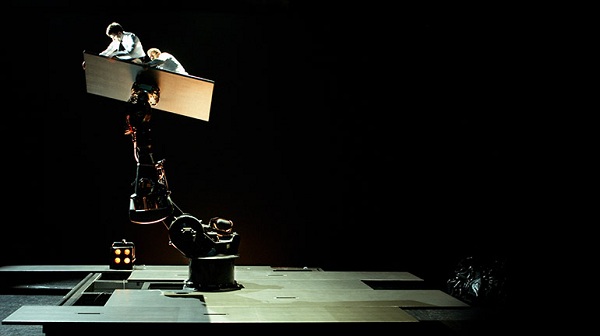 À l’instar de Plan B, relaté sur ces pages dix ans après sa création, Sans Objet, autre spectacle d’Aurélien Bory, tourne depuis ses débuts en 2010. Il faut dire que les propositions du Français sont suffisamment intemporelles pour pouvoir plaire sur la longueur et que leur caractère très ludique et abordable suscite une large adhésion. Nouvel exemple avec Sans Objet, donc, pour lequel la réflexion de Bory est partie d’une machine-robot, récupérée dans un atelier mécanique de l’industrie automobile et customisé à loisir ensuite. Placé sur une estrade, l’appareil est, au début, recouvert d’une grande bâche en plastique sombre, que deux interprètes vont ôter avant d’évoluer de concert sur le plateau.