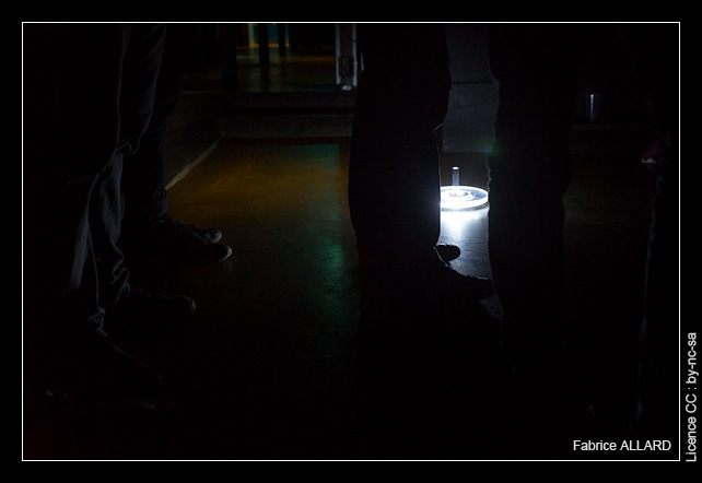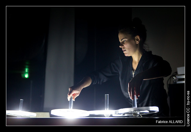 Sur scène, une grande table avec 4 toupies imposantes dont on devine qu’elles ne servent que de contrôleur. En effet sur le côté un laptop est là pour générer la musique selon les informations qu’il reçoit des toupies. Au dessus de cette table, une caméra est censée capter les gestes de l’artiste et rotations des toupies lumineuses afin de projeter l’ensemble en fond de scène. C’est ce dispositif qui pour nous semble fonctionner mais qui apparemment ne donne pas entière satisfaction à la Québécoise qui décidera d’éteindre le projecteur avant de démarrer son set. Regrettable dans le cadre du Festival Némo dont le principe même est de faire le lien entre arts sonores et arts visuels.