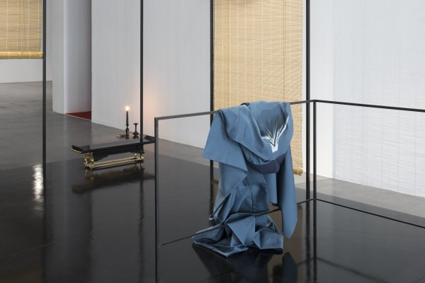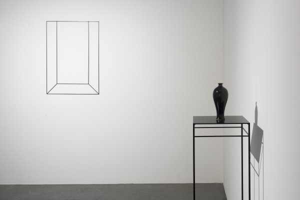 Deux pavillons, uniquement matérialisés par les arêtes des murs prennent ainsi place dans les salles, marqués par la présence, à l’intérieur de ces lieux, d’objets typiques (stores en bambou, autel bouddhiste, bols chantants tibétains, tasse à thé, vase chinois, bougeoir japonais…). Ailleurs, ce sont des petits modèles en laiton du Pavillon d’or de Kyoto, ou des pierres représentant des têtes de Bouddha que l’on retrouve, manière d’affirmer que son intérêt ne se limite pas à l’aspect domestique de cet endroit du monde.