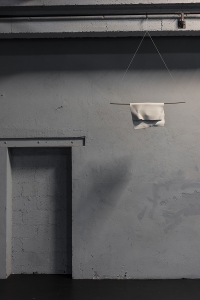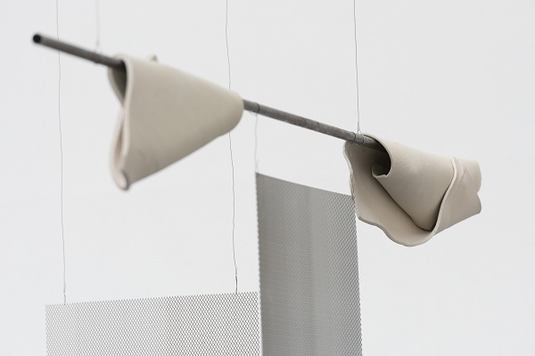 Pour autant, au-delà du petit jeu d’investigation, et de la matérialisation du processus d’échange, l’exposition frappe par sa capacité à allier le fragile et le solide, notamment lorsque les créations sont suspendues, enroulées autour d’un tube en acier, repliées sur elles-mêmes ou encore tout simplement accrochées au mur, comme en lévitation. La robustesse apparente des œuvres se confronte donc à leur capacité de pliage tandis qu’on cherche, en scrutant l’intérieur de celles qui sont accessibles, s’il n’est pas possible d’y voir des résidus de l’objet originel. Le caractère rudimentaire du processus créatif est également à mettre en relation avec la chaîne d’interventions ayant conduit aux résultats présentés devant nos yeux, comme si l’adjonction de tous ces petits concours (don d’un objet, échange avec un autre, cuisson, disposition dans un espace) était résumée dans une forme finie et exposée telle quelle.