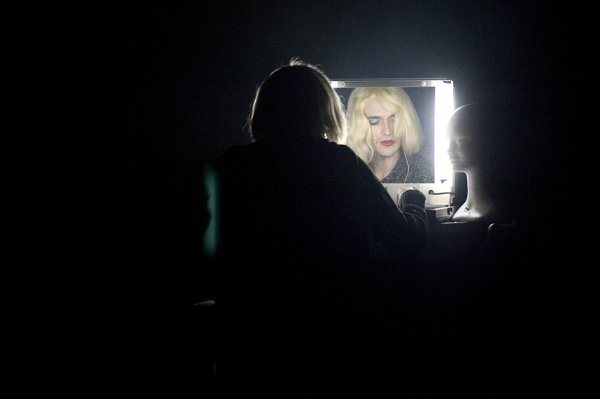 Précisément, le spectacle débute par une série d’interprétations a capella de tubes des dernières décennies (principalement Madonna, donc, mais aussi Francis Cabrel, par exemple), circonscrits à leurs premier couplet et premier refrain, et enchaînés aussi sec, sans aucun accompagnement musical. Vêtu d’un sweat à capuche et armé d’une cannette, Capdevielle s’y dépeint en ado mal dans sa peau, gauche et emprunté, ne sachant que faire de son grand corps, sinon se glisser dans la peau de ses vedettes. Le changement d’enveloppe interviendra par la suite, avec une séance de travestissement faisant apparaître une grande blonde emperruquée et dotée de hauts escarpins à paillettes.