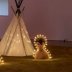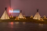 Bénéficiant de la totalité de la grande salle, il a alors été possible de présenter deux vastes installations, La Nuit de Claude Lévêque et Bar des Acariens de Jean-Luc Vilmouth. Si ce n’est la lumière qui émane de ces créations (ampoules jaunes, d’une part, néons roses, d’autre part), rien de véritablement commun entre l’étendue de sable, au milieu de laquelle sont disposés trois tipis et des visages d’enfants, et le mobilier de café sur lequel des grandes photos d’acariens sont reproduites. Une forme d’étrangeté un rien inquiétante émane cependant des deux créations, comme si une part de fantastique avait investi les lieux, entre dérive possible d’un campement et récit d’anticipation.