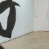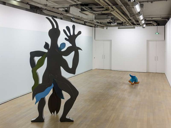 Au reste, les deux seuls corps entiers et véritablement anthropomorphes sont la plus grande et la plus petite des créations de Sarah Tritz. De fait, le géant qui trône dans la dernière salle de la Fondation, fait d’aluminium peint et articulé un peu à la façon des pantins impose par sa taille tandis qu’une toute petite gymnaste de papier lui fait face, délicatement accrochée à un mur, saisie en plein mouvement (à la manière de ces papillons punaisés) et particulièrement fragile. Leur dialogue muet, leur opposition de tailles et de matériaux dit bien la cohérence de la proposition de la Française.