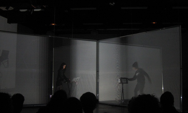 Après le triangle de toiles derrière lequel était posté le duo lors de leur prestation au Transient Festival en 2014, ce sont quatre toiles disposées en croix qui entouraient, ici, les deux artistes. Placés en miroir, ils étaient ainsi mis de profil par rapport au public, Nakamoto côté cour avec ses machines et Schipfer côté jardin avec ses deux laptops. Musicalement, la grosse demi-heure de concert fut une succession de travaux fins, précis, quasi-mathématiques, entre electronica et IDM, avec un gros travail sur les fréquences et la volonté de livrer des morceaux pour partie très efficaces, avec tout ce qu’il fallait pour faire hocher la tête des spectateurs assis sur des coussins. Si les transitions entre morceaux nous parurent un peu hachées, de même que les pièces arythmiques nous convainquirent moins que celles avec des pulsations, l’ensemble séduisit assurément et confirma notre très bonne impression de l’an dernier, lorsque nous vîmes Takami Nakamoto en solo.