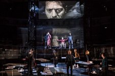 Pendant les travaux au Théâtre de la Ville, ce dernier est délocalisé dans plusieurs autres institutions partenaires mais aussi, pour ses principales activités, à l’Espace Pierre Cardin. Situé en bas des Champs-Élysées, ce lieu offre certainement davantage de latitude pour la scénographique que le grand plateau majestueux de la Place du Châtelet, difficilement modulable. Précisément, pour la création d’une pièce rare d’Albert Camus, Emmanuel Demarcy-Mota fait le choix d’un dispositif trifrontal, en inversant orchestre et scène, plaçant ce dernier au centre d’un espace entouré de trois séries de gradins. Entre arène et agora, ce plateau reconfiguré favorise également des entrées et sorties multiples venant de toutes parts.