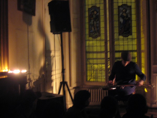 Les lancinants traits de six-cordes, réalisés grâce à l’archet étaient ensuite mis en perspective avec quelques accords pincés, pour atteindre progressivement une saturation de l’espace avec des quasi-larsens et poussées sonores. Pour terminer, des souffles et anfractuosités rejoignirent cet agrégat pour constituer une structure probablement moins enveloppante que ce que nous aurions pu imaginer (la configuration du lieu jouait peut-être, à cet égard) mais confortant nos positions à l’endroit du Norvégien.