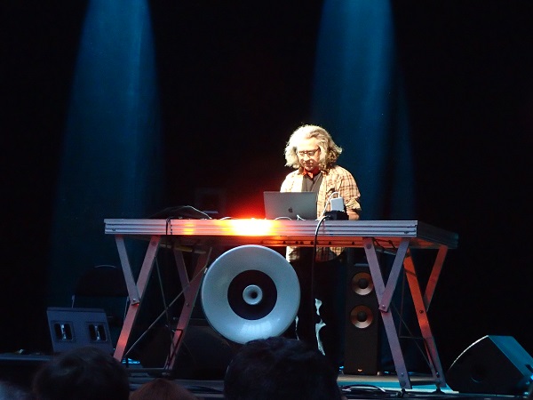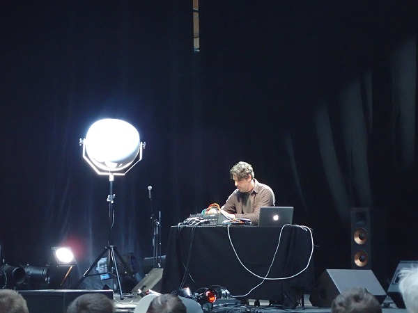 Posté de l’autre côté de la scène, Akira Rabelais débuta par un morceau dans lequel des vocalises féminines et masculines étaient mêlées, dans une tonalité proche du chant grégorien. Le titre suivant fut un déferlement de grésillements, laissant augurer d’un set assez disparate mais surprenant. Las ! le reste de la vingtaine de minutes laissa place à une lecture féminine pré-enregistrée de La Femme 100 Têtes de Max Ernst, roman-collages surréaliste, assise sur une nappe discrète ou quelques touches de piano ou de cordes. Saluer la figure de l’auteur dadaïste n’est, en soi, pas nécessairement une mauvaise chose mais, à force, la proposition vira à la pose, voire frôla l’escroquerie, n’évoluant presque pas, s’étirant dans la durée jusqu’à l’ennui le plus profond…