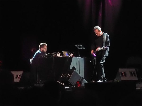 Pour clore la soirée, en même temps que cette édition inégale de Présences Électronique (dont on ressortit, outre le concert de Leafcutter John, sommet indéniable du week-end, ceux de Kara-Lis Coverdale, Hild Sofie Tafjord et Méryll Ampe, ainsi que les diffusions de Thomas Tilly et Jana Winderen), Minibus Pimps était présenté au public parisien. Projet conjoint de John Paul Jones (bassiste de Led Zeppelin !) et Helge Sten (alias Deathprod, et membre de Supersilent), cet attelage ambitionne de traiter électroniquement les sons de basse et guitare. C’est ainsi que l’instrument de l’Anglais, joué au bottleneck et doté d’un panneau changeant de couleur sur sa table d’harmonie, envoya des accords que le Norvégien retravaillait grâce à ses machines. Assis sur le côté de la table, ce dernier lâchait quelques traits de guitare électrique saturée, eux aussi filtrés, tamis utilisé quel que soit le registre emprunté par les deux musiciens, passant d’un quasi-blues à des rivages presque prog-rock.