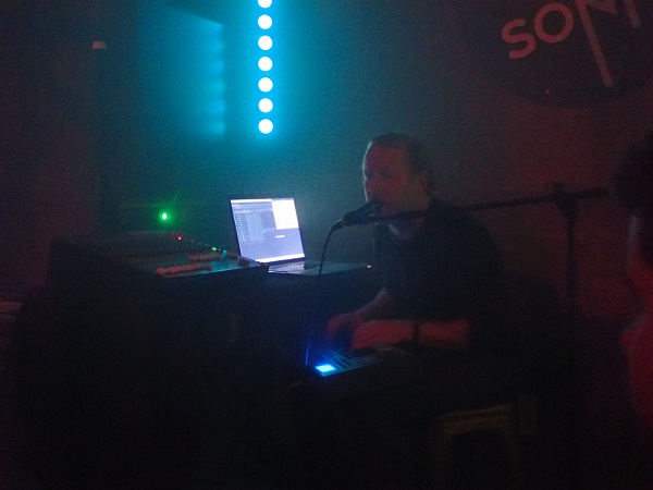 De fait, débuter par Matt Jencik (qu’on connaît comme membre d’Implodes et ancien participant à Don Caballero) permit de se placer immédiatement dans une veine ambient. Lançant des boucles avec son synthé, l’États-Unien y ajoutait des accords plaqués sur son clavier-séquenceur, plus ou moins aigus et plus ou moins saturés. Des morceaux assez denses et homogènes étaient ainsi proposés, même si on put regretter qu’il y ait une ou deux secondes de coupure entre chaque titre, venant rompre ce continuum. Si le caractère un peu chargé de certains accords donnait une coloration proche d’un orgue d’église aux sonorités produites, le jeu sur la vibration et l’oscillation des nappes et accords se trouvait intelligemment relayé par les lumières projetées de derrière, parfois mises en position stroboscopique.