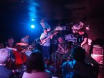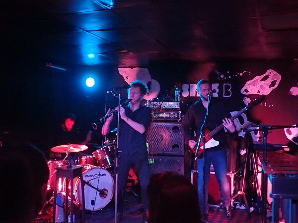 Avec sa configuration peu habituelle (clarinette, basse, batterie), cette formation intrigua plutôt de prime abord ; d’autant plus que le chant de Clément Barbier saisit par sa tessiture profonde. Instrumentalement, leur forme de jazz-post-rock offrait suffisamment de place à chacun des membres du groupe pour que s’épanouissent quelques soli (de basse, de clarinette) voire une intervention du chanteur au mégaphone. Si sa voix grave pouvait, par moments, s’égarer dans un certain maniérisme quand elle s’essayait au parlé narratif, Laurent Macaigne, à la basse, agissait comme efficace contrepoint avec sa voix de tête pour assurer les chœurs. De même, le caractère assez figé de ce dernier constituait un bon équilibre avec l’attitude un rien théâtrale de Barbier (déhanchements, râles animaux et cris) tandis que Simon Thomy passait des balais aux mailloches, ou bien s’emparait de maracas. Peut-être un peu trop long (trois bons quarts d’heure), leur set eut cependant le mérite d’être plutôt en adéquation, musicalement, avec la suite.