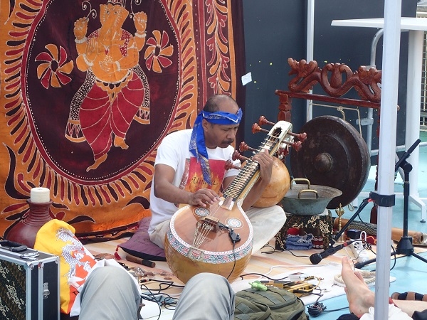 Installé sous un barnum et sur un tapis, entouré de tous ses instruments et machines, portant un T-Shirt à son nom (au cas où on ait un doute ?), Ujjaya délivra effectivement un concert dans son style de prédilection dit « ethno-ambient ». De fait, utilisant majoritairement sa vînâ (instrument à cordes doté de deux grosses sphères faisant office de résonateurs), le musicien adjoignait les sons de ses cordes à des nappes lancées de son sampler. Affublée d’un micro fixé sur la table, la vînâ pouvait alors voir ses sons agrémentés d’une réverbération qui venait judicieusement amplifier l’aspect mystique de l’ensemble. Si, dans ce contexte, on pouvait regretter que les apports vocaux fussent très largement issus de samples et non pas chantés en direct, la capacité d’Hery Randriambololona à habiter l’espace sonore était certaine et s’accommodait parfaitement des conditions : soleil intermittent, public partagé entre transats et matelas, proximité de la Seine, léger tangage de la péniche.