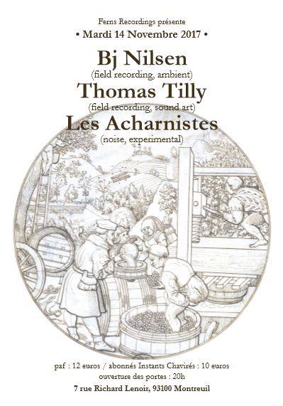 Petite chambrée aux Instants Chavirés pour cette soirée organisée par le label Ferns Recordings autour de la sortie d’un album de BJ Nilsen, musicien souvent présent sur ces pages mais pas nécessairement pour ses concerts (le seul chroniqué sur ces pages le fut en… 2004). Pour débuter, le label français avait convié Les Acharnistes, trio mêlant électroniques, noise et lecture du Manifeste de l’Acharniste (texte publié début 2015 par Leonel Houssam). Sur fond de dark ambient et de noise, musicalement correct, on eut donc le droit à de la prose au bord de l’affligeant entre provocations désarmantes de banalité (« À bas les riches ! ») et dénonciations de l’époque (Facebook, les experts télévisés, etc…) totalement inoffensives.