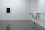 Après l’avoir croisé à plusieurs reprises dans des expositions collectives (encore au printemps dernier, à la Fondation d’Entreprise Ricard), on était plutôt intéressé a priori par l’exposition personnelle que lui consacre le FRAC Île-de-France au Plateau, lieu où, d’ailleurs, on avait vu des œuvres du Français pour la première fois. Dans la lignée de la veste bleue nuit vue en mars, Pierre Paulin (rien à voir avec le designer du même nom) propose ici plusieurs suites de vêtements, posés sur des barres fixes semblables à celles qu’on trouve dans les salles de danse. Blanches, bleues nuit, noires ou réversibles, ces tenues se trouvent doublées de texte sérigraphié, manière de relier habits et langage. Il nous est alors pointé que l’individu peut ainsi se singulariser, avec ces tenues insolites mais aussi jouer une sorte d’uniformisation, par le jeu des marques (les vêtements sont des reproductions d’habits du jeune homme) auquel renvoient aussi une boîte Adidas dans laquelle trône une dubplate, le « boom » qu’on entend pendant tout le parcours et qui est une captation du bruit du ballon de basket que Michael Jordan faisait rebondir dans une publicité Nike en 1995, ou encore la « main chaude », cet outil qu’utilisent les gantiers pour confectionner leurs accessoires.