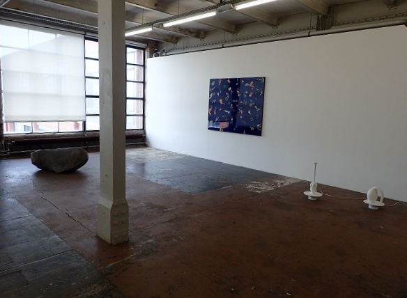 Sous ce dernier rapport, le Français réactive le principe du bow-window faussement éclaté, grâce à un jeu par un adhésif collé dessus, dispositif vu précédemment au Centre culturel suisse. Sur la vitre d’une des grandes baies vitrées du Crédac, le paysage industriel et immobilier d’Ivry-sur-Seine est donc reproduit, mais fracturé en son centre comme si une pierre l’avait traversé. Un travail de recréation du réel, accompagné d’un léger décalage, se dessine alors, d’autant plus que la perspective copiée sur la vitre est, en vérité, insuperposable au véritable paysage. Même jeu sur la reproduction désynchronisée avec les pistils surdimensionnés et positionnés sur des supports rotatifs ou bien avec un rocher zoormorphique tout juste peint grossièrement pour figurer un orque.