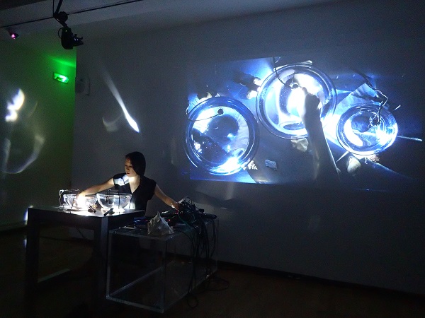 Plus tard, ce furent deux petits cailloux-éponges effervescents qui furent introduits dans ses bols en verre transparent, générant des crépitements plus ou moins aigus en fonction de la taille du récipient. Tomoko Sauvage combina ceux-ci à des larsens obtenus en faisant vibrer la surface de l’eau avec sa main, retrouvant un geste bien connu de sa part. Visuellement, une caméra était placée au-dessus d’elle, permettant de voir le contenu des bols sur le mur du fond, tandis que deux lampes de poche éclairaient les bols, créant des reflets sur les murs, sortes d’ondes vibrantes d’eau déplacée. Pour terminer, et afin de définitivement faire le lien avec le Pacifique, elle se saisit d’un coquillage qu’elle plongea dans l’eau : les bulles d’air qui sortirent de sa carapace produisirent une rythmique intelligemment gérée.